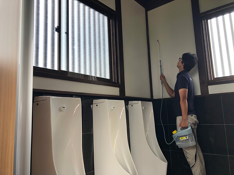 水溶性の液体を噴霧器で施工場所に噴霧するだけ。商品の特徴や害虫の特性を学び、お客様のニーズを踏まえた「害虫ブロック技能講習受講者」が施工します。